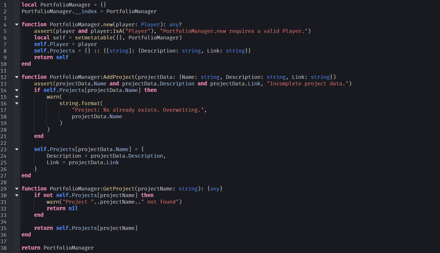 In the attached link, you can find a screenshot of one of my most elite scripts, created in Roblox. It's a script that creates portfolio's for players, and let's them see and add custom projects to it. This is all written in advanced OOP (= Object Oriented Programming) in Lua(u).